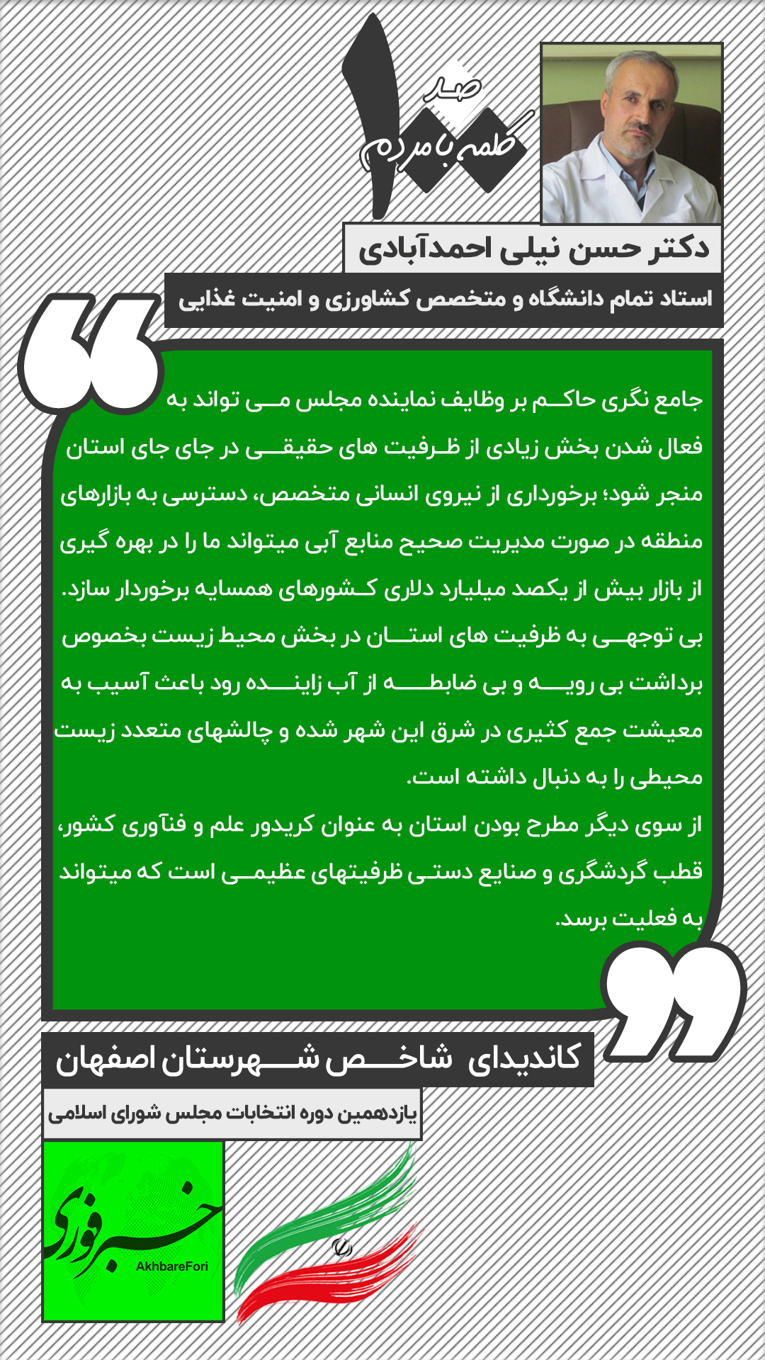 کدام کاندیدای شاخص!!!! طرف رشته اش دامپزشکیه است در تبلیغات زده متخصص اممنیت غذایی و کشاورزی کدام اینترنت را بگردی 4 تا موضوع که مربوط به حداقل یک سال پی ش ایشان باشد پیدا نمی شود. در ضمن استاد تمام یعنی ( پرفسور) ایشان استاد تمام کدام دانشگاه است. ایشان در دانشگاه اصفهان حتی تدریس هم نمیکند!!!!! فقط مشاور رییس دانشگاه در حوزه ویروس شناسی است