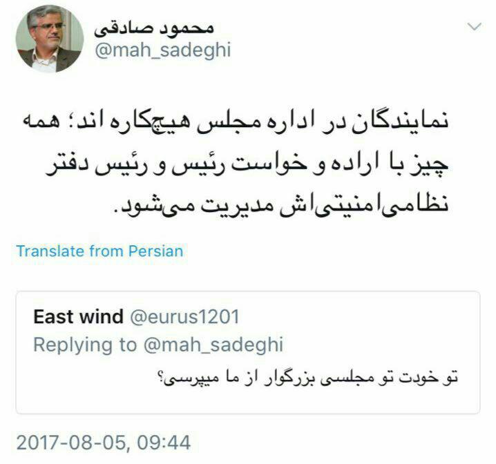 پاسخ محمود صادقی به کاربرانی که از عدم حضور برخی بزرگان واهل سنت در مراسم تحلیف گلایه داشتند: نمایندگان در اداره مجلس هیچ کارهاند؛همه چیز با اراده وخواست رئیس مدیریت می شود!