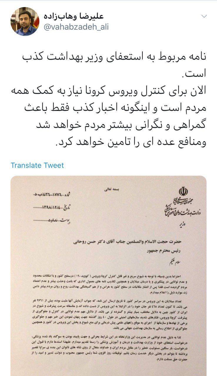 مشاور وزیر بهداشت نامهای که با عنوان استعفای سعید نمکی در شبکههای اجتماعی دست به دست میشود، تکذیب کرد