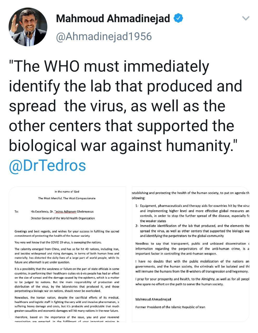 احمدی نژاد در توییتی خطاب به مدیرکل سازمان بهداشت جهانی نوشت: سازمان بهداشت جهانی باید بلافاصله آزمایشگاهی که ویروس را تولید و پخش کرده است، و همچنین مراکز دیگری که از جنگ بیولوژیکی علیه بشریت حمایت کرده اند، شناسایی کند.