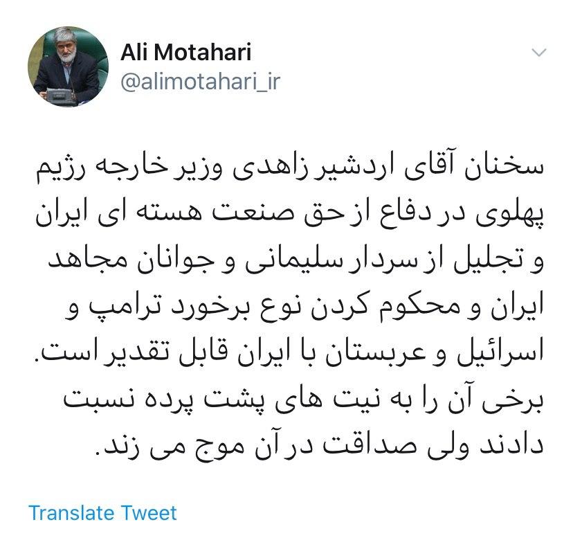 تقدیر علی مطهری از اردشیر زاهدی به دنبال انتقاد از سیاستهای آمریکا