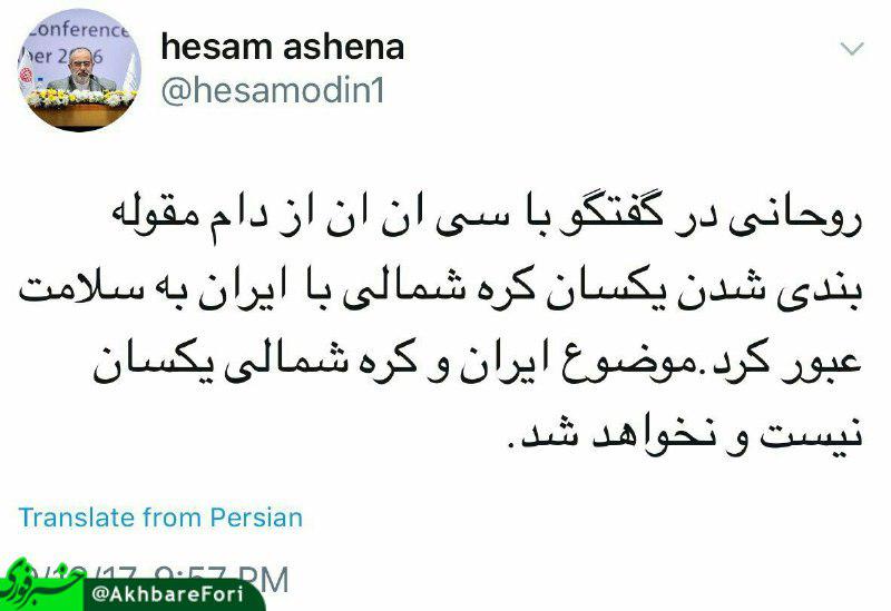 در همین راستا حسامالدین آشنا درباره گفتکوی روحانی و کریستن امانپور در CNN در تویتر نوشت: