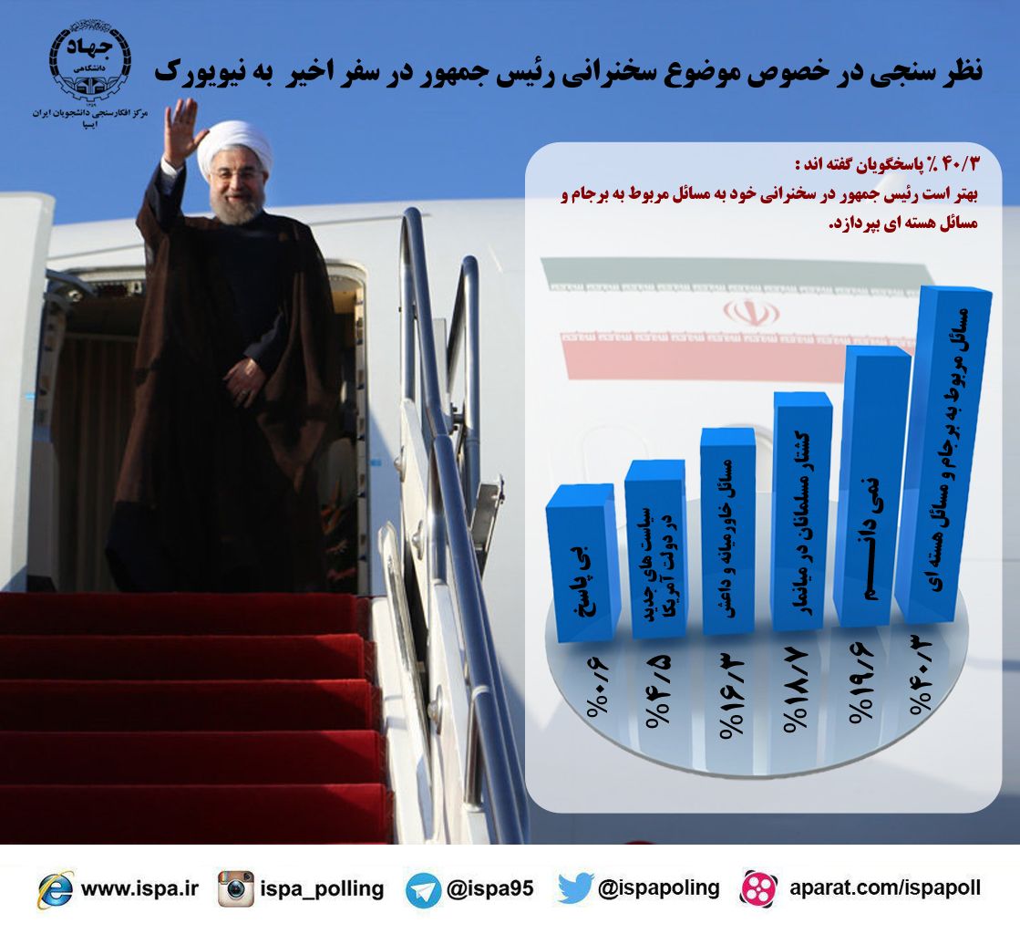 طبق نتایج نظرسنجی اخیر ایسپا؛ ۴۰.۳% مردم ايران گفته اند موضوع سخنرانی امروز رئیس جمهور در سازمان ملل، بهتر است در خصوص مسائل برجام و انرژي صلح آميزهسته ای باشد.