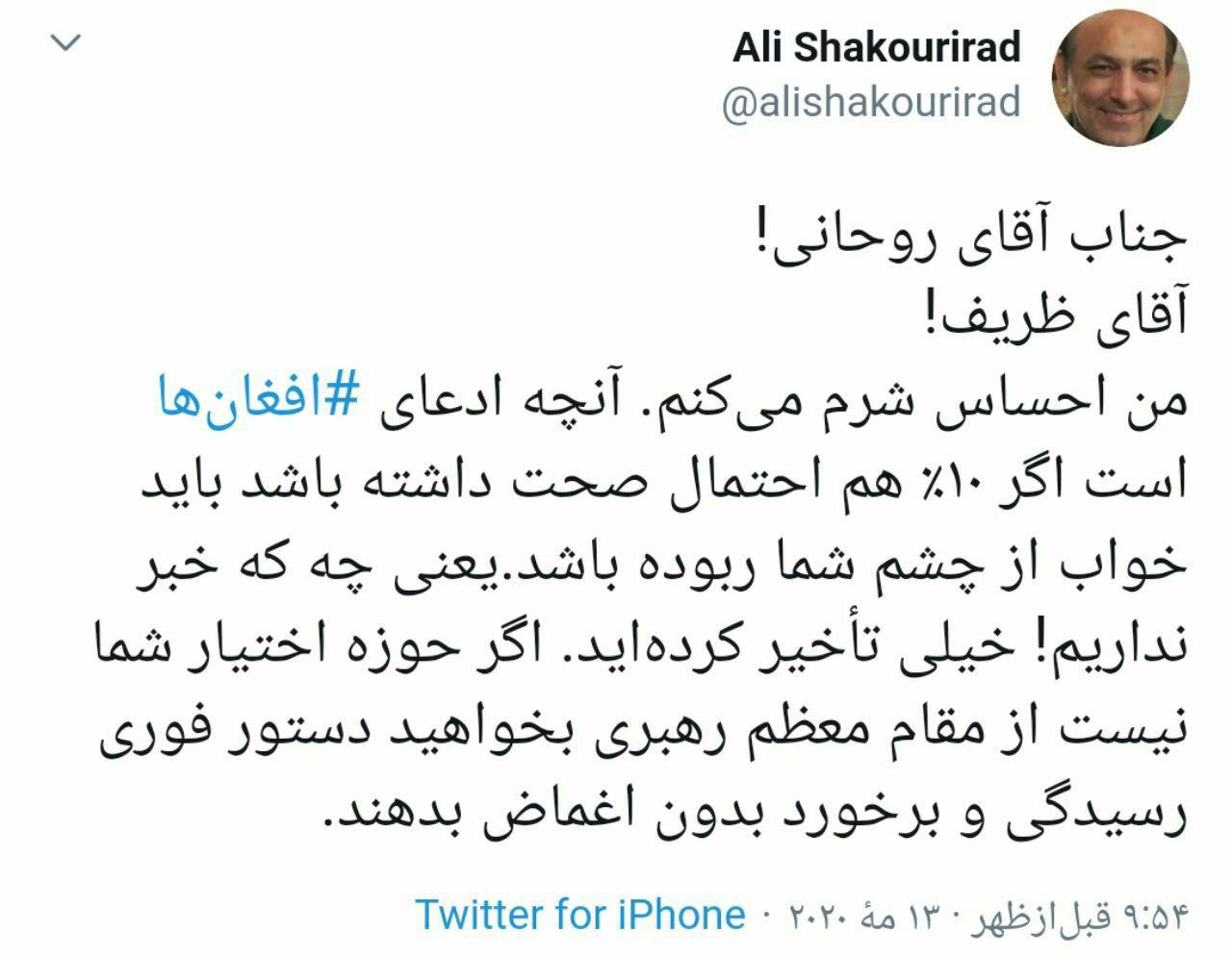 علی شکوری راد دبیر کل حزب اتحاد ملت در توییتی نوشت: من احساس شرم مىکنم. آنچه ادعای افغانها است اگر ۱۰٪ هم احتمال صحت داشته باشد باید خواب از چشم شما ربوده باشد.یعنی چه که خبر نداریم.