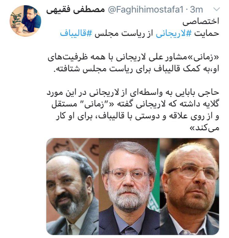 منبعی مطلع به من گفت که «زمانی» مشاور علی لاریجانی با همه ظرفیتهای او،به کمک قالیباف برای ریاست مجلس شتافته است.