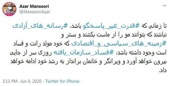 آذر منصوری، قائممقام حزب اتحاد ملت نوشت: تا زمانی که قدرت غیرپاسخگو باشد، رسانههای آزادی نباشند که بتوانند مو را از ماست بکشند و بستر و زمینههای سیاسی و اقتصادی که خود مولد رانت و فساد است وجود داشته باشد، فساد سازمانیافته روزی سر از جایی بیرون خواهد آورد و ویرانگر و خانمان برانداز به رشد خود ادامه خواهد داد.