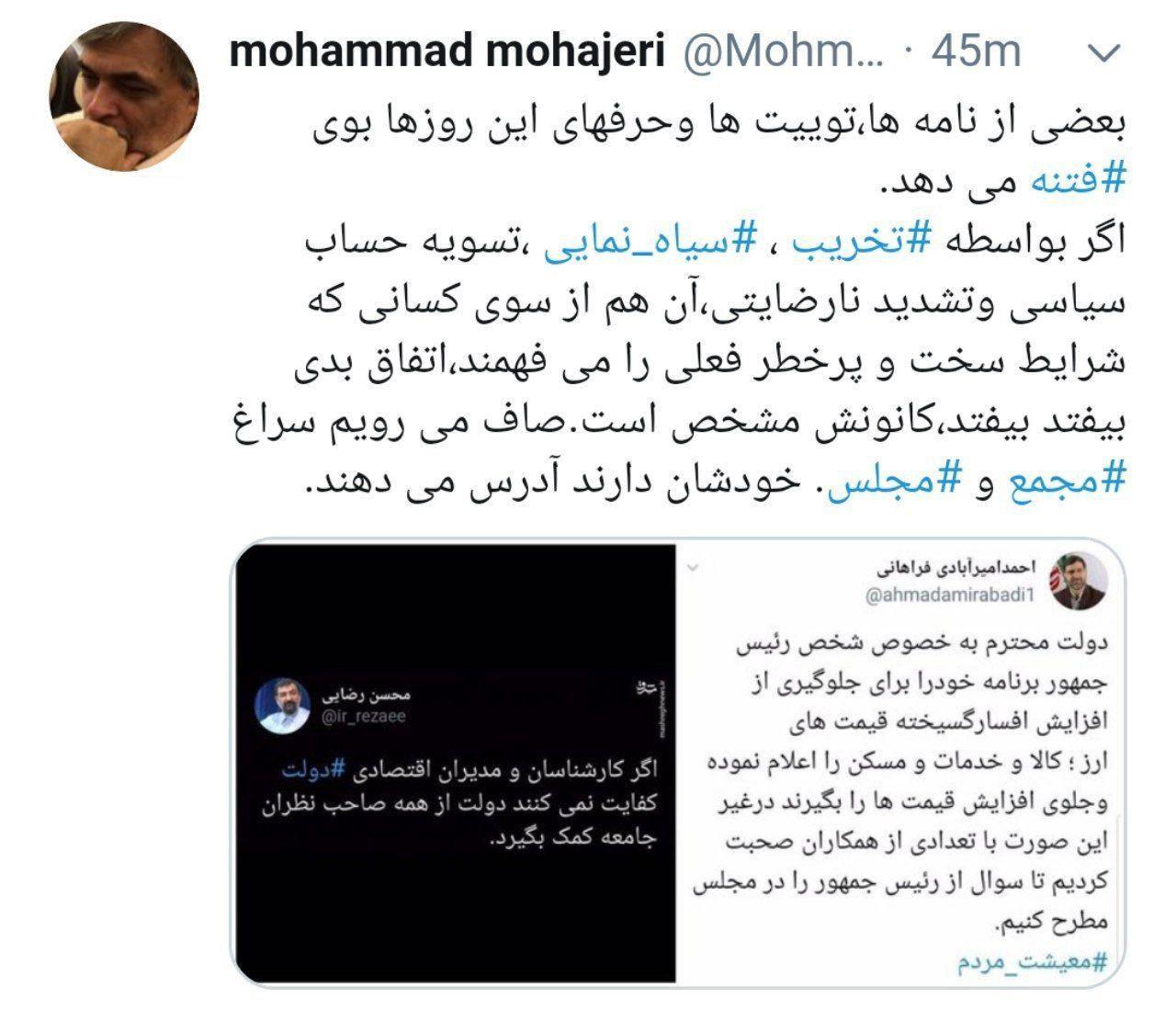 محمد مهاجری، فعال رسانهای اصولگرا در توییتی نوشت: بعضی از نامهها، توییتها و حرفهای این روزها بوی فتنه می دهد. اگر بواسطه تخریب، سیاه نمایی، تسویه حساب سیاسی و تشدید نارضایتی، آن هم از سوی کسانی که شرایط سخت و پرخطر فعلی را می فهمند، اتفاق بدی بیفتد، کانونش مشخص است. صاف میرویم سراغ مجمع و مجلس. خودشان دارند آدرس میدهند.