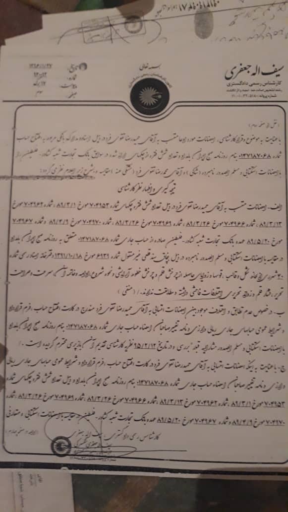 اینها شرکت هواپیمایی داشتند، از مردم پول گرفتند تا کربلا ببرند، اما نفرستادند، چک کشیدند، من ماشینم را فروختم و پول دادم، هنوز پولم را پس نگرفتهام. برای همه در قوه قضاییه نامه فرستادهام. به رئیس دیوان مراجعه کردم، به آقای منتظری نامه زدم و ایشان هم به دادستانی تهران نامه زدند، اما خبری نشد. پدر من راننده تاکسی بود، برادر من قبلا ۲۰۰ میلیون بدهکار بود، چطور لکسوس سوار میشود؟ اگر من رئیس بخش مالی تو بودم، چرا یک ریال پول به حساب من واریز نشده است.