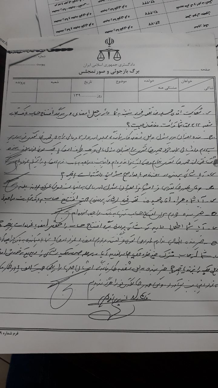 حتی به دفتر مقاعات عالی هم رفتم، آنها هم گفتند که باید از دادگاه پیگیری کنید. من دیگر ناامیدم. اگر بچه نداشتم یک ثانیه در ایران نمیماندم. نمیتوانم تا ابد این درد را تحمل کنم. زن و بچهی من چه گناهی کردند. یک رای به نفع من در دادگاه صادر نشده است. برادر من یک سوزوکی ویتارا و سانتافه و لکسوس دارد. شرکت فیلم سازی دارد و الان شش فیلمش در حال ساخت است. به تازگی هم یک ابلاغیه به من ارسال شده و برادرم از من شکایت کرده و من را متهم به دریافت کارت سوخت خودش کرده در حالیکه خانهی من خلع ید است و نمیتوانم اصلا به آنجا بروم. الان باید تا روز یکشنبه پنج مرداد ماه به شعبهی بازپرسی ۴ دادسرای ناحیه ۱۶ مراجعه کنم.