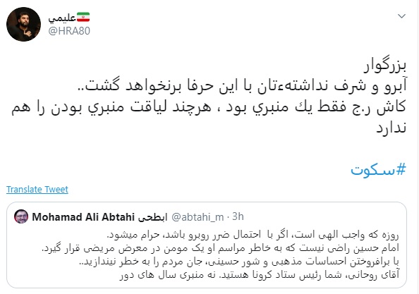 حمید علیمی مداح معروف با بازنشر توییت محمد علی ابطحی به اظهار نظر او اعتراض کرد.