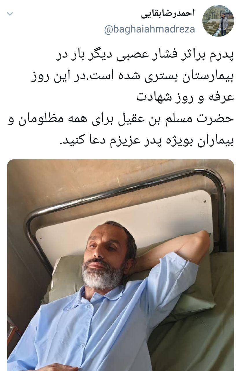 احمدزضا بقایی از بستری شدن دوباره پدرش در بیمارستان خبر داد.