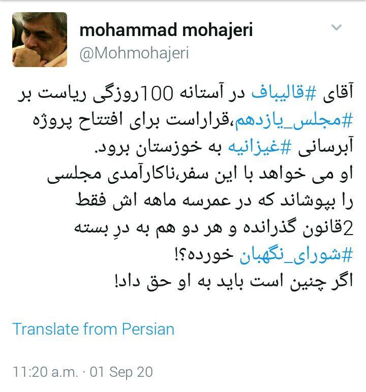 محمد مهاجری در واکنش به سفر قالیباف به خوزستان در توییتی نوشت: او می خواهد با این سفر، ناکارآمدی مجلسی را بپوشاند که در عمر سه ماهه اش فقط ۲ قانون گذرانده و هر دو هم به در بسته شورای نگهبان خورده است.