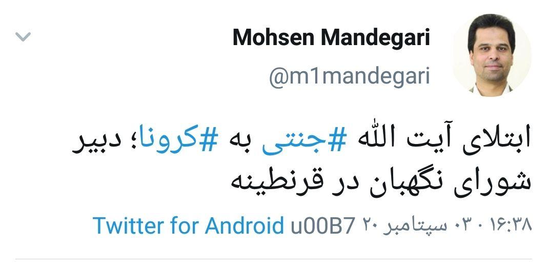 محسن ماندگاری، سردبیر پیشین روزنامه جام جم در توییتی از ابتلای آیت الله جنتی به كرونا خبر داد.