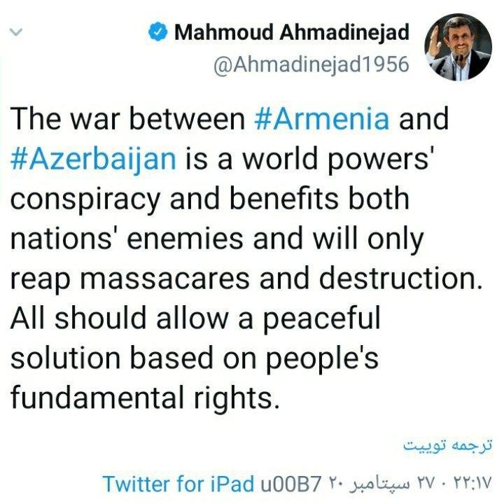 احمدینژاد درباره جنگ آذربایجان و ارمنستان در توییتی نوشت: