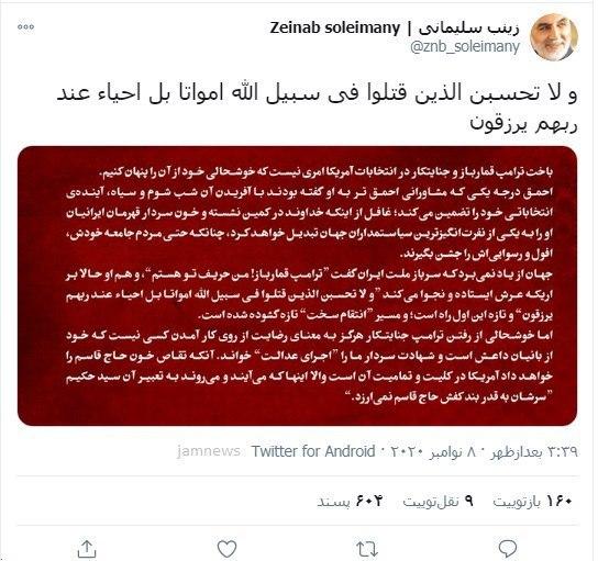 فرزند حاج قاسم به شکست ترامپ و پیروزی بایدن واکنش نشان داد.