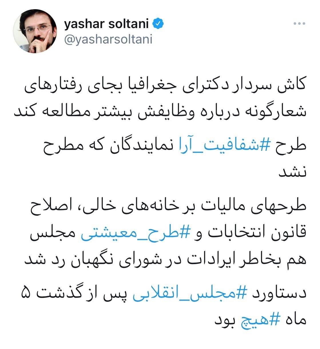 یاشار سلطانی در توییتی به مجلس یازدهم و قالیباف انتقاد کرد: