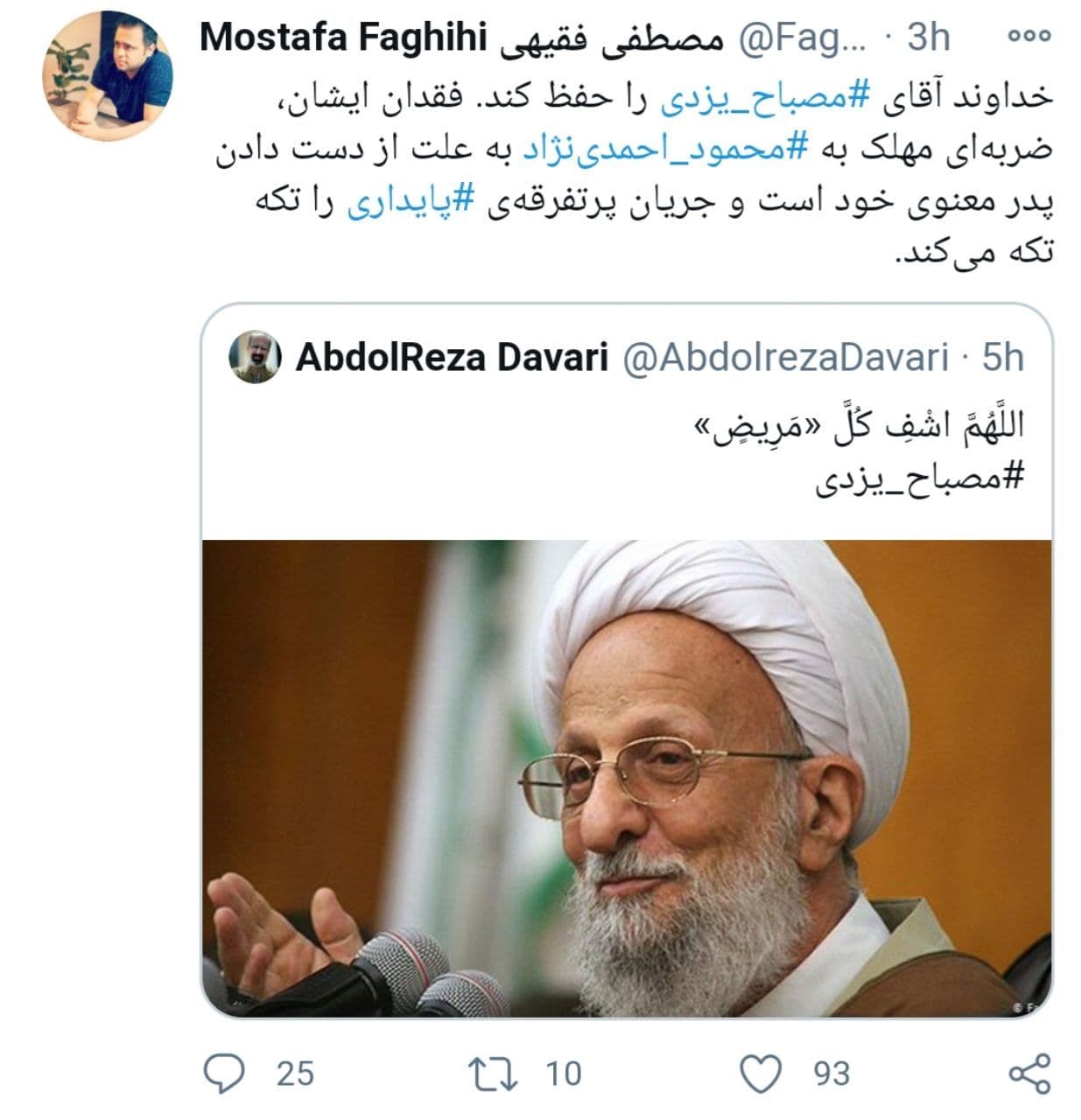 مصطفی فقیهی روزنامهنگار اصلاحطلب دو توئیتی پیش بینی کرد که پیامد حال وخیم آیتالله مصباح، فروپاشی جبهه پایداری است.