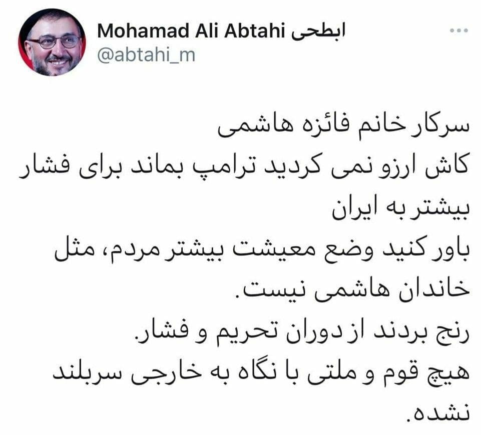 ابطحی در صفحه شخصی خود در توییتر نوشت:سرکار خانم فائزه هاشمی! کاش آرزو نمی کردید ترامپ بماند برای فشار بیشتر به ایران. باور کنید وضع معیشت بیشتر مردم، مثل خاندان هاشمی نیست. رنج بردند از دوران تحریم و فشار. هیچ قوم و ملتی با نگاه به خارجی سربلند نشده.