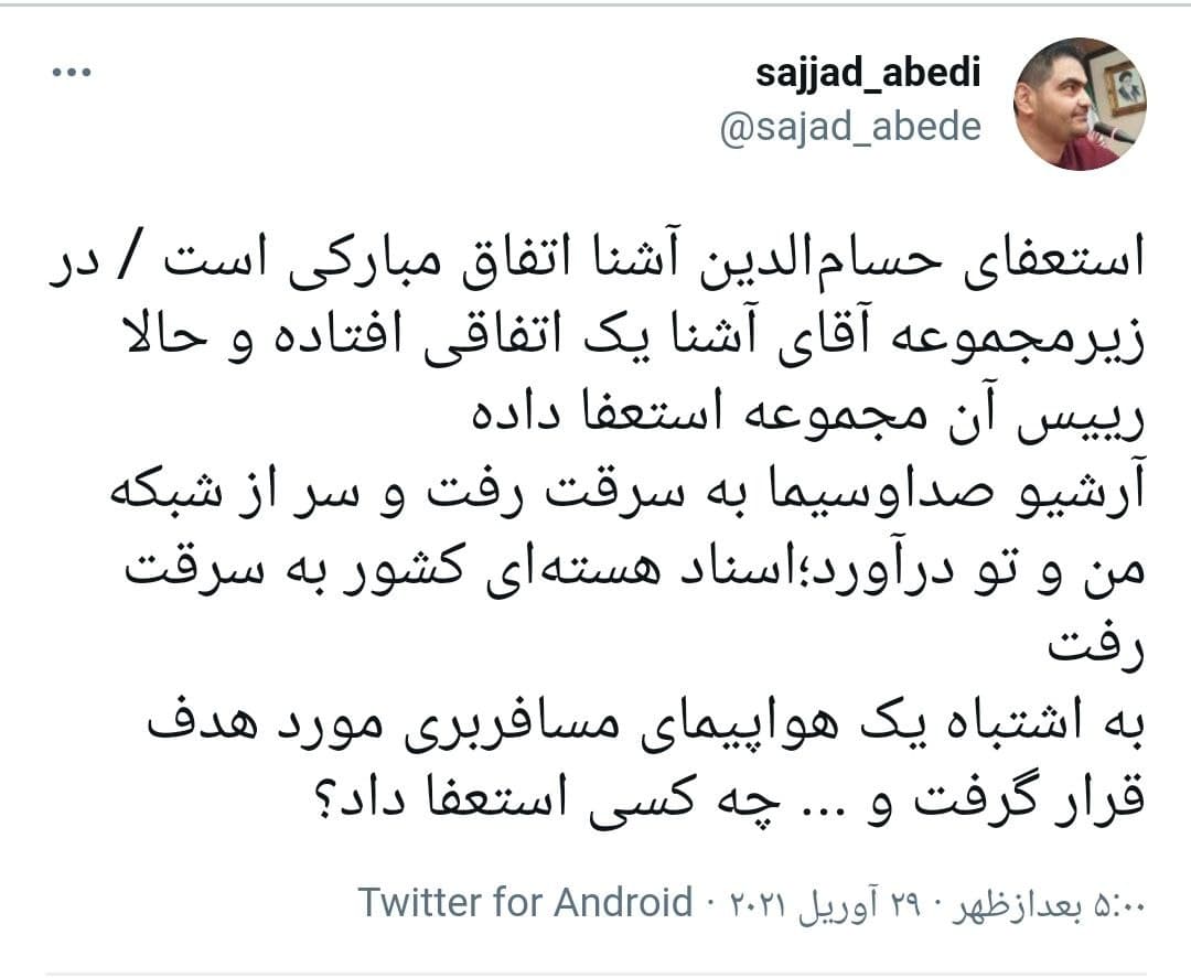 سجاد عابدی نوشت: در زیرمجموعه آقای آشنا یک اتفاقی افتاده و حالا رییس آن مجموعه استعفا داده آرشیو صداوسیما به سرقت رفت و سر از شبکه من و تو درآورد؛اسناد هسته‌ای کشور به سرقت رفت به اشتباه یک هواپیمای مسافربری مورد هدف قرار گرفت و ...
