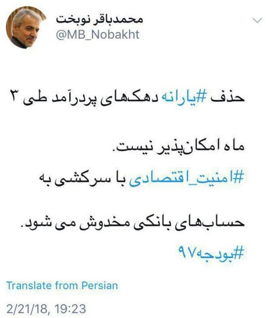 به گزارش خبر فوری به نقل از ایسنا، محمدباقر نوبخت در صفحه شخصی خود در توییتر نوشت: «حذف یارانه دهک های پردرآمد طی سه ماه امکان پذیر نیست. امنیت اقتصادی با سرکشی به حساب های بانکی مخدوش می شود.»