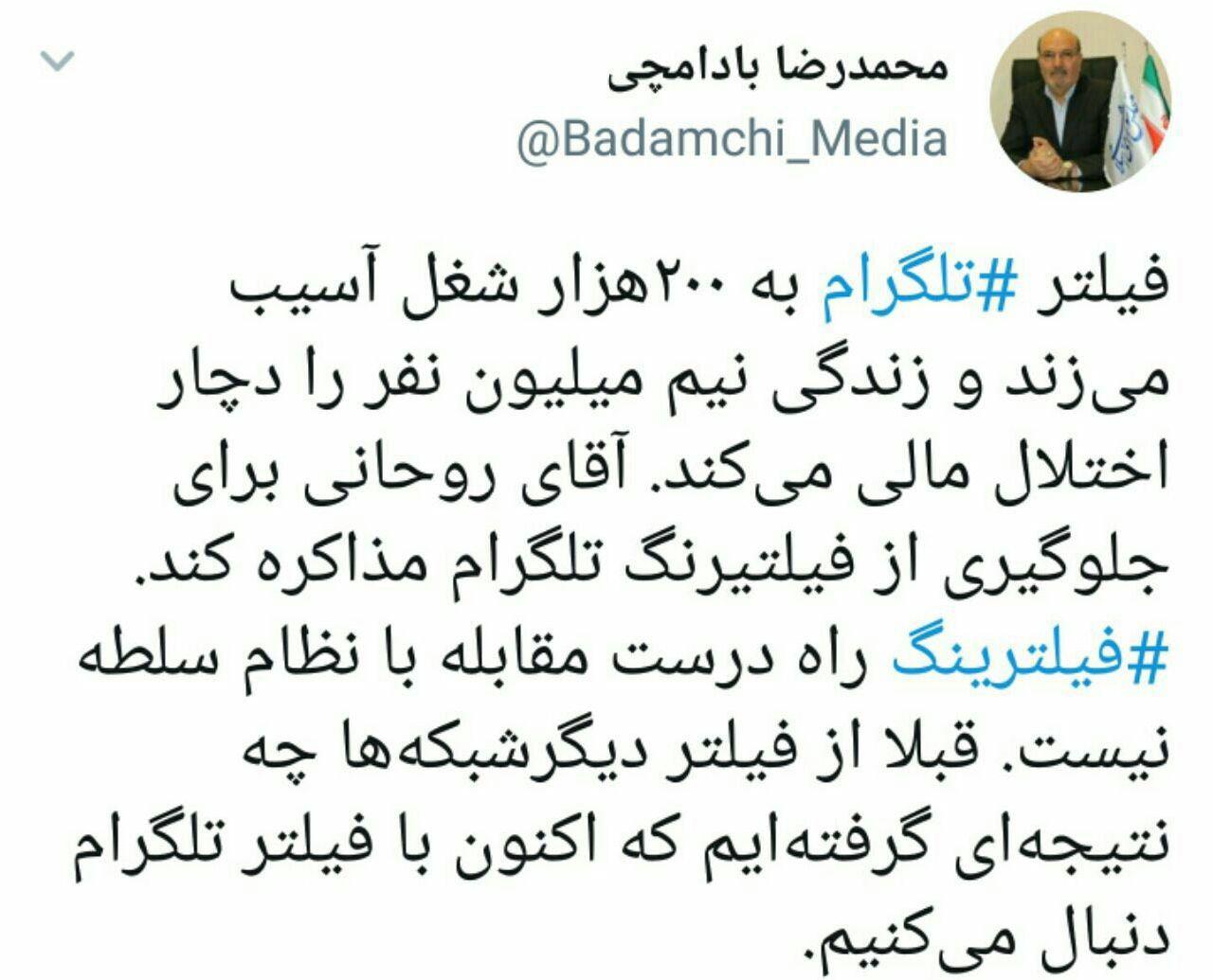 محمد رضا بادامچی نماینده مردم تهران در توییتر خود نوشت فیلتر تلگرام به 200 هزار شغل آسیب می زند.