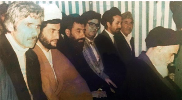 مرحوم سید مهدی طباطبایی نفر سوم از سمت چپ در حال اقتدای نماز به امام خمینی