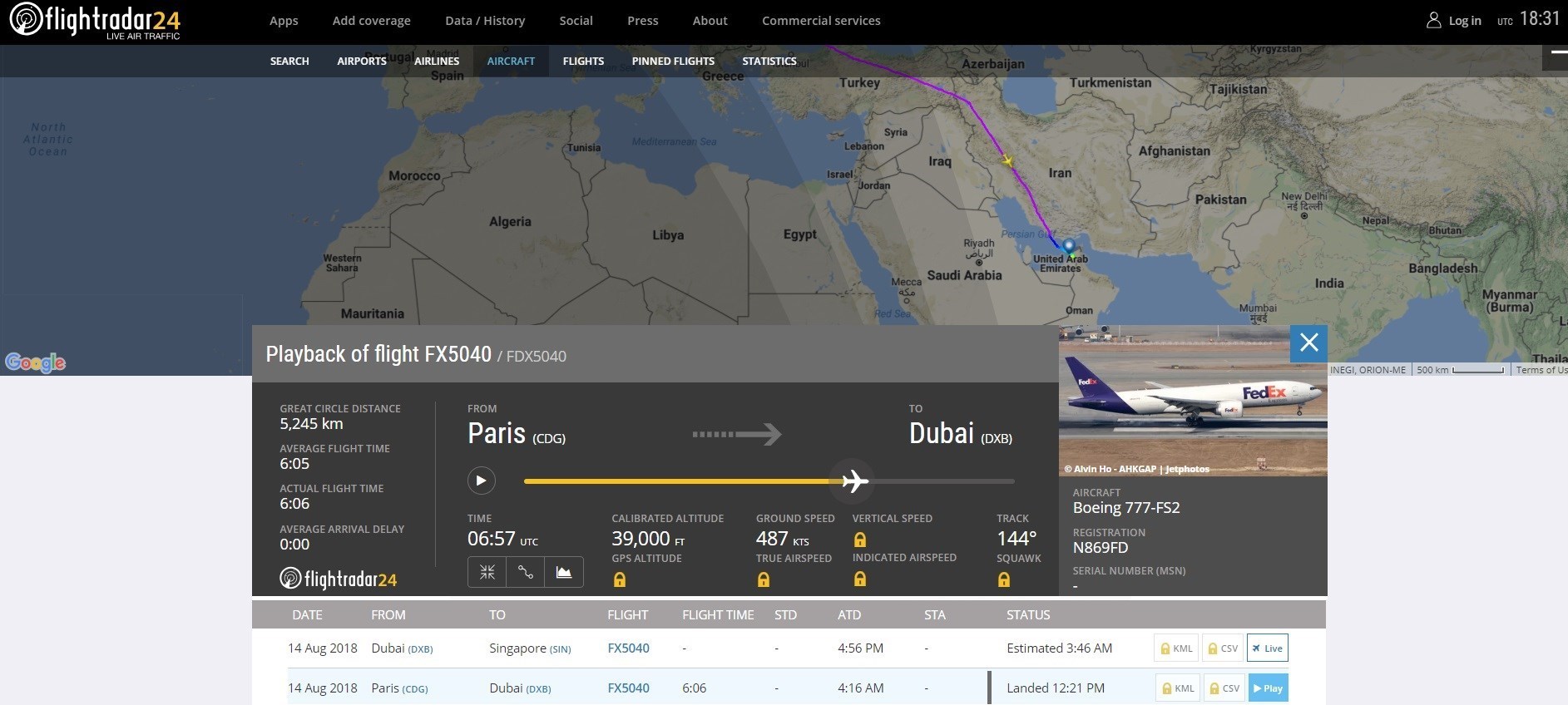 عبور هواپیمای بوئینگ 777 شرکت آمریکایی FedEx با علامت ثبتی N869FD از آسمان کشورمان - 23 مردادماه 97