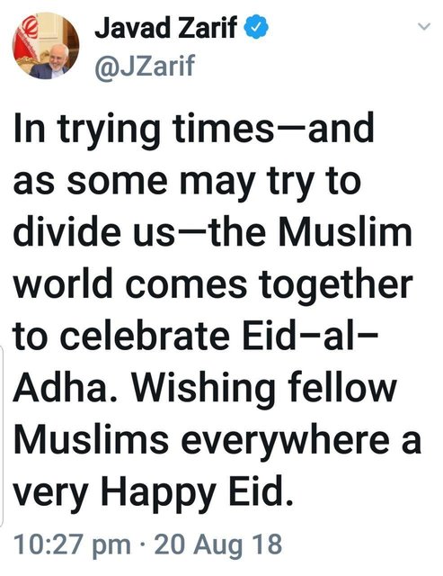 در پیام محمدجواد ظریف آمده است: «در شرایط دشوار کنونی و در زمانی که برخی برای انشقاق میان ما مسلمانان تلاش می کنند، مسلمین جهان گردهم آمدند تا عید قربان را جشن بگیرند. عید قربان را به همه مسلمانان در هر جای جهان تبریک عرض می کنم.»