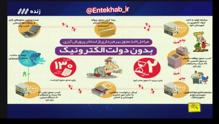 فلوچارتي كه آذري جهرمي از يك "شبكه عنكبوتي استعلام گيري ٥٠ مرحله اي براي اخذ يك مجوز" منتشر كرد
