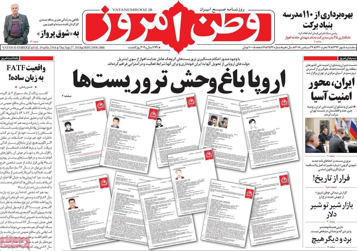 وطن امروز به مسئله حمله تروریستی اهواز و دستگیری تروریست ها پرداخت و از صدور احکام دستگیری تروریست ها از سوی اینترپل خبر داد. وطن امروز نوشت علیرغم صدور حکم، کشورهای اروپایی از تحویل تروریست ها خودداری کرده اند.
