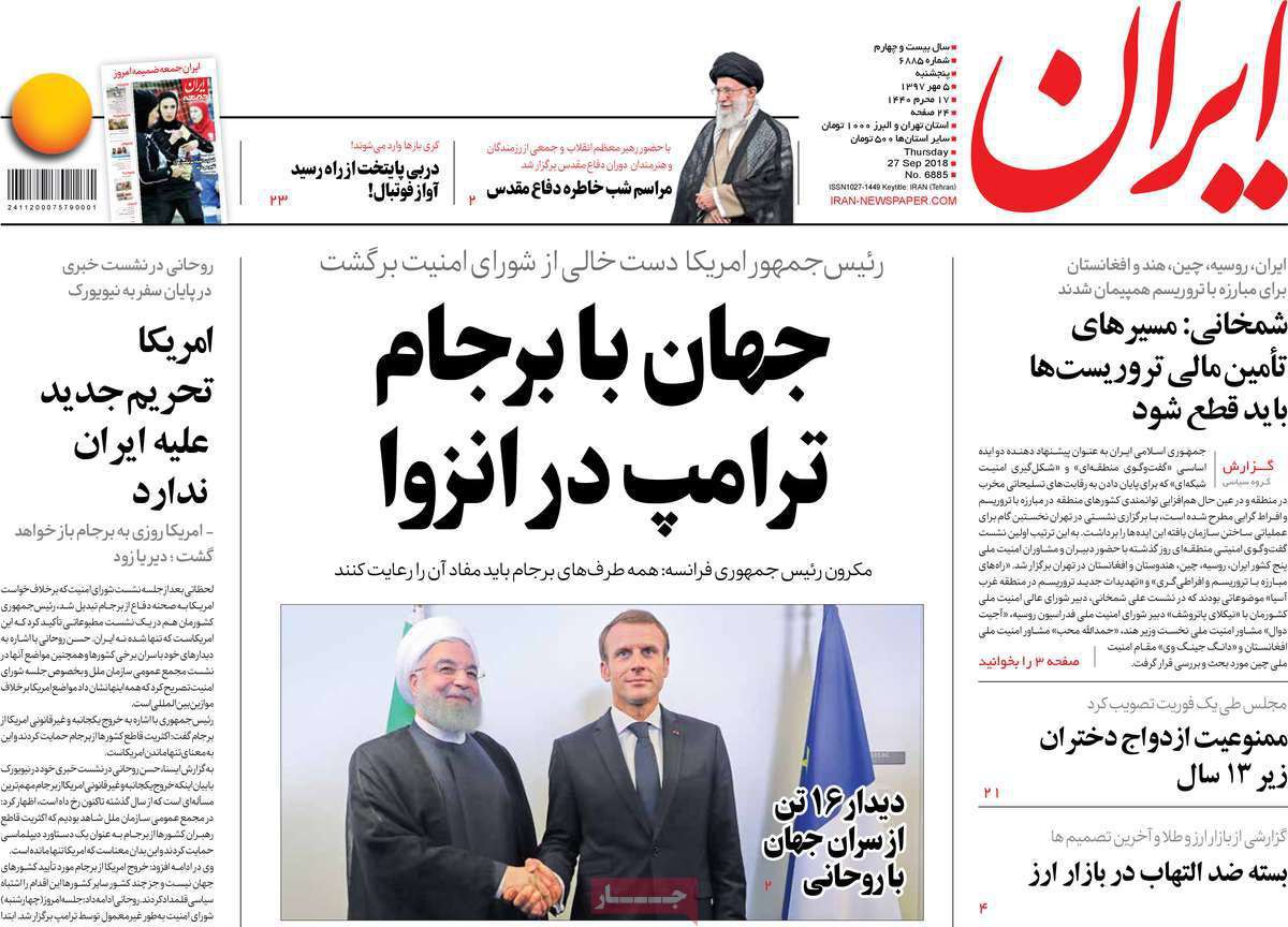 روزنامه ایران با عکسی از روحانی و مکرون از قول رییس جمهور فرانسه نوشت: همه طرف های برجام باید مفاد آن را رعایت کنند