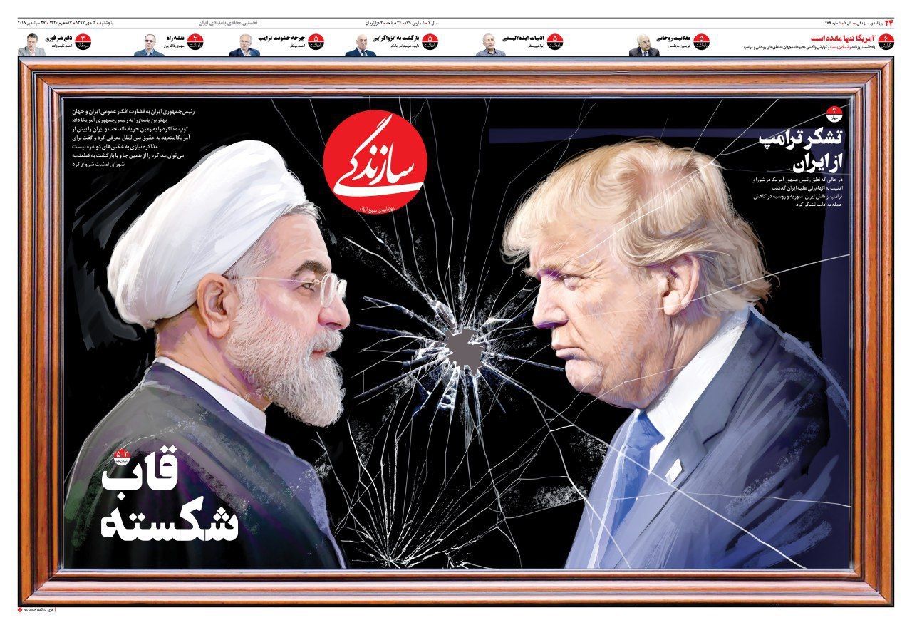 روزنامه سازندگی با طرحی جالب و خلاقانه به نشست شورای امنیت پرداخت. طرح جلد سازندگی شامل عکس روحانی و ترامپ در یک قاب است