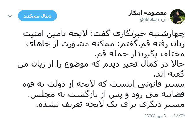 ابتکار در تکذیب خبری به نقل از وی در مورد لایحه تامین امنیت زنان در برابر خشونت توئیت زد.