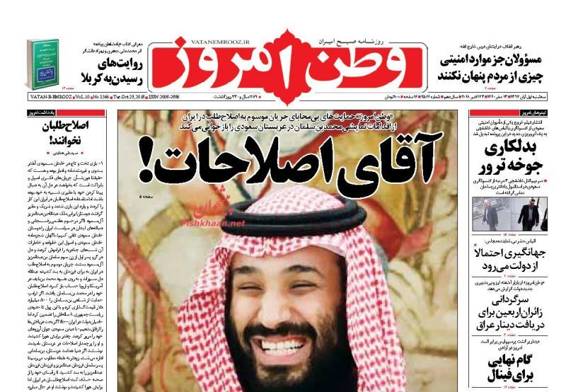 وطن امروز در اقدامی عجیب و جالب با انتخاب عکسی از بن سلمان تیتر زد: آقای اصلاحات. این روزنامه با این تیتر به باز خوانی حمایت جریان اصلاح طلب ایران از اقدامات بن سلمان در عربستان سعودی پرداخته است.