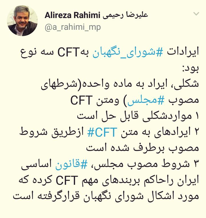 علیرضا رحیمی: ایرادات شورای نگهبان به CFT سه نوع بود