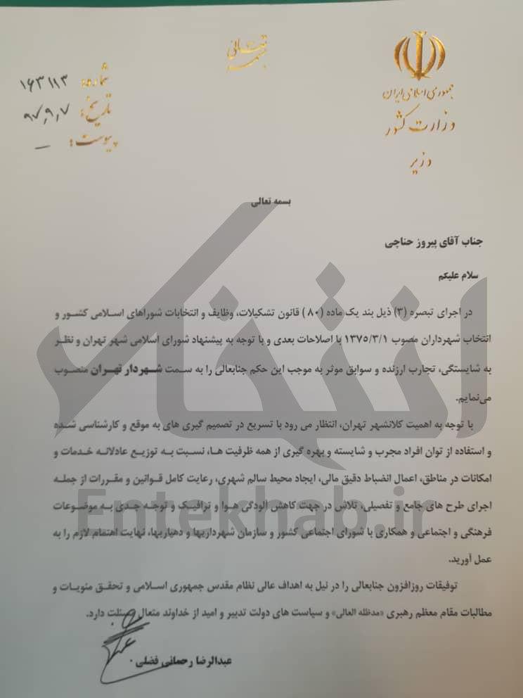 وی افزود: بدین ترتیب با توجه به تکمیل مستندات قانونی لازم برای صدور حکم شهردار تهران، حکم انتصاب آقای حناچی امروز از سوی وزیر محترم کشور صادر شد.