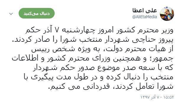 همچنین سخنگوی شورای شهر تهران در توئیتی این خبر را منتشر کرد و نوشت: حکم پیروز حناچی، شهردار جدید تهران صادر شد