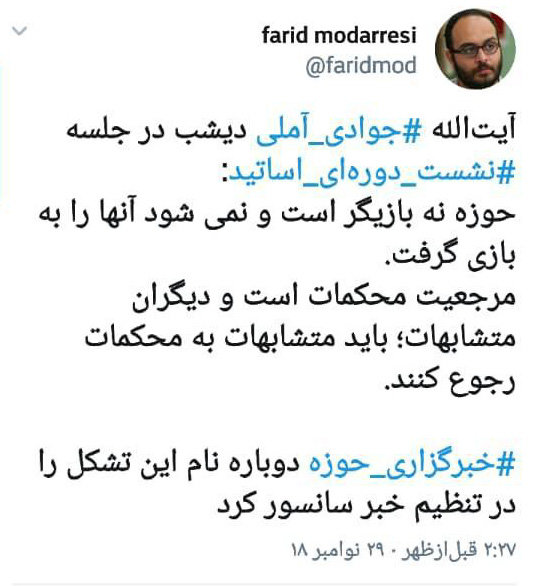 فرید مدرسی در توئیتی نوشت: آیت الله جوادی آملی در نشست دوره‌ای اساتید گفت: حوزه نه بازیگر است و نمی‌شود آنها را به بازی گرفت. مرجعیت محکمات است و دیگران متشابهات؛ باید متشابهات به محکمات رجوع کنند.