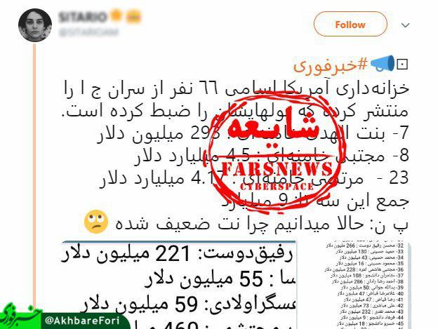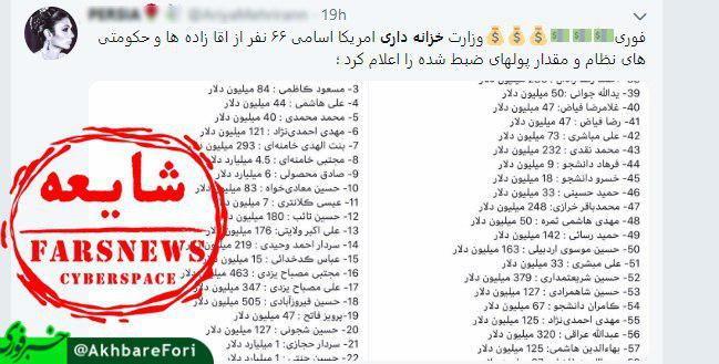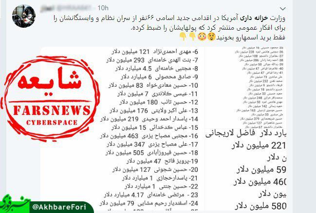 این رسانهها که از روز گذشته شایعه فوت سردار قاسم سلیمانی را منتشر کردند طی روزهای گذشته هم شایعه کردند که خزانەداری آمریکا اسامی ٦٦ نفر از سران جمهوری اسلامی ایران و یا بستگانشان کە پولهایشان را ضبط کردە، منتشر کرده است.
