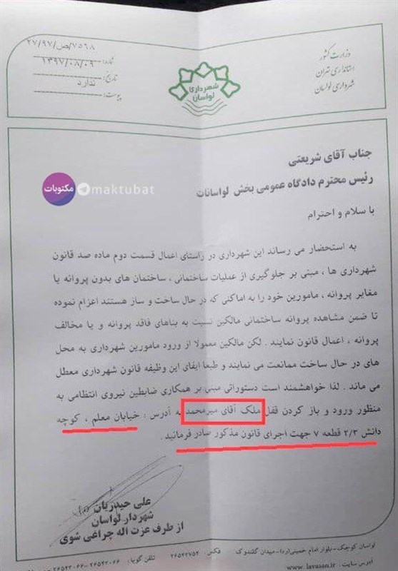 نامه شهرداری به رییس دادگاه عمومی لواسانات که ماموران شهرداری را برای بررسی تخلفات راه ندادهاند