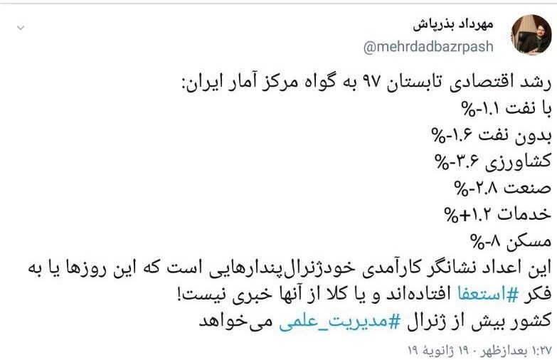 سنیم، مهرداد بذرپاش طی مطلبی طی مطلبی در صفحه شخصی خود در توئیتر، با انتقاد از کاهش رشد اقتصادی کشور با استناد به آمار مرکز آمار ایران، نوشت: این اعداد نشانگر کارآمدی خود ژنرال پندارهایی است که این روزها یا به فکر استعفا افتادهاند و یا کلاً از آنها خبری نیست کشور بیش از ژنرال به مدیریت علمی میخواهد.