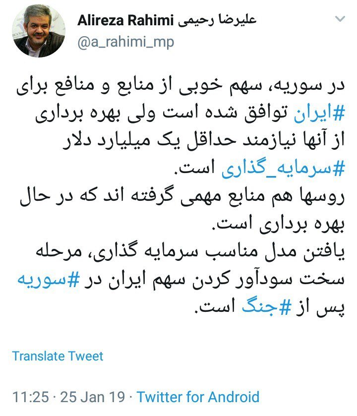 علیرضا رحیمی، عضو کمیسیون امنیت ملی و سیاست خارجی مجلس در توییتی نوشت: در سوریه، سهم خوبی از منابع و منافع برای ایران توافق شده است ولی بهره برداری از آنها نیازمند حداقل یک میلیارد دلار سرمایه گذاری است.