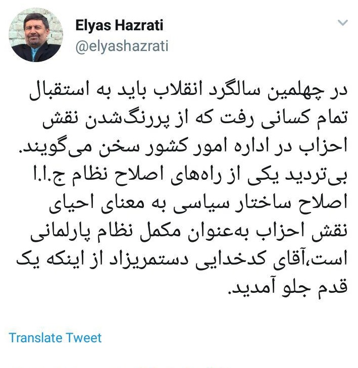 الیاس حضرتی، قائممقام حزب اعتمادملی در توییتی نوشت: در چهلمین سالگرد انقلاب باید به استقبال تمام کسانی رفت که از پررنگشدن نقش احزاب در اداره امور کشور سخن میگویند.