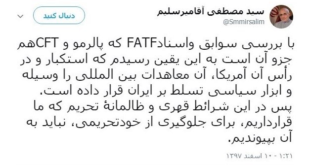 سید مصطفی میرسلیم عضو مجمع تشخیص مصلحت نظام طی مطلبی در صفحه شخصی خود نوشت که "با بررسى سوابق و اسنادFATF که پالرمو و CFTهم جزو آن است به این یقین رسیده است که استکبار و در رأس آن آمریکا، آن معاهدات بین المللى را وسیله و ابزار سیاسى تسلط بر ایران قرار داده است".