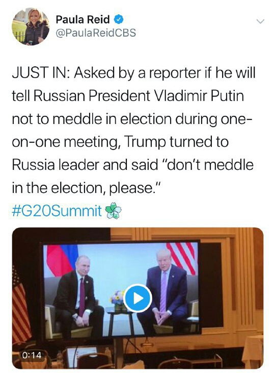به گزارش خبر فوری ، توییتها نشان میدهد که دقایقی پیش خبرنگاران از دونالد ترامپ در حضور رییس جمهور روسیه پرسیدند: «آیا به پوتین خواهی گفت که در انتخابات آمریکا دخالت نکند؟» ترامپ بلافاصله به ولادیمیر پوتین گفت: «در انتخابات ما دخالت نکنید.»