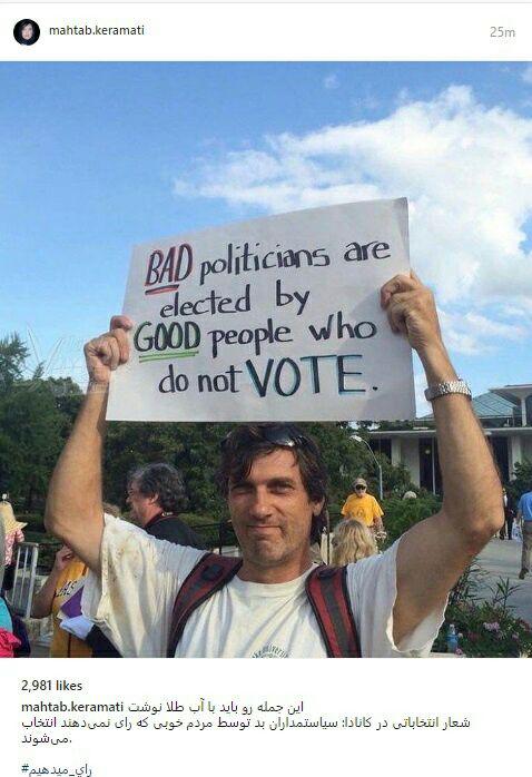 مهتاب کرامتی در صفحه اینستاگرام خود با انتشار عکسی از هواداران خود خواست که در انتخابات پیش رو شرکت کنند.