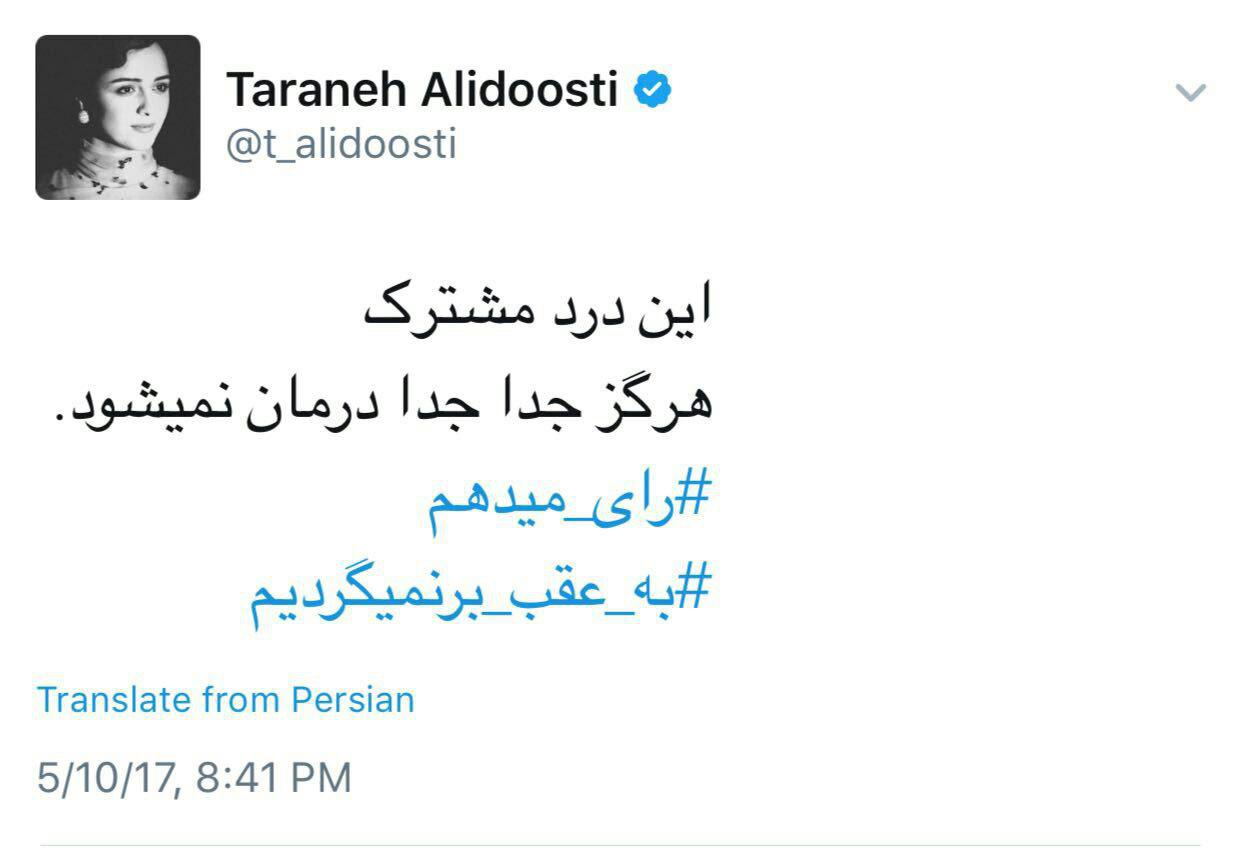 ترانه علیدوستی در جدیدترین توئیت خود نظرش را درباره انتخابات ریاست جمهوری به اشتراک گذاشته است.