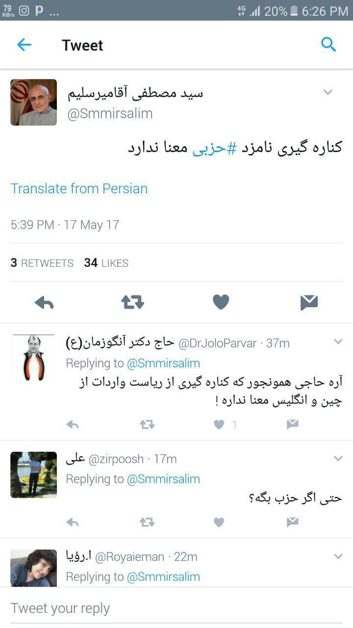 مصطفی میرسلیم نامزد انتخابات دوازدهمین دوره ریاست جمهوری در صفحه تویتر خود نوشت : کنارگیری نامزد حزبی معنا ندارد.