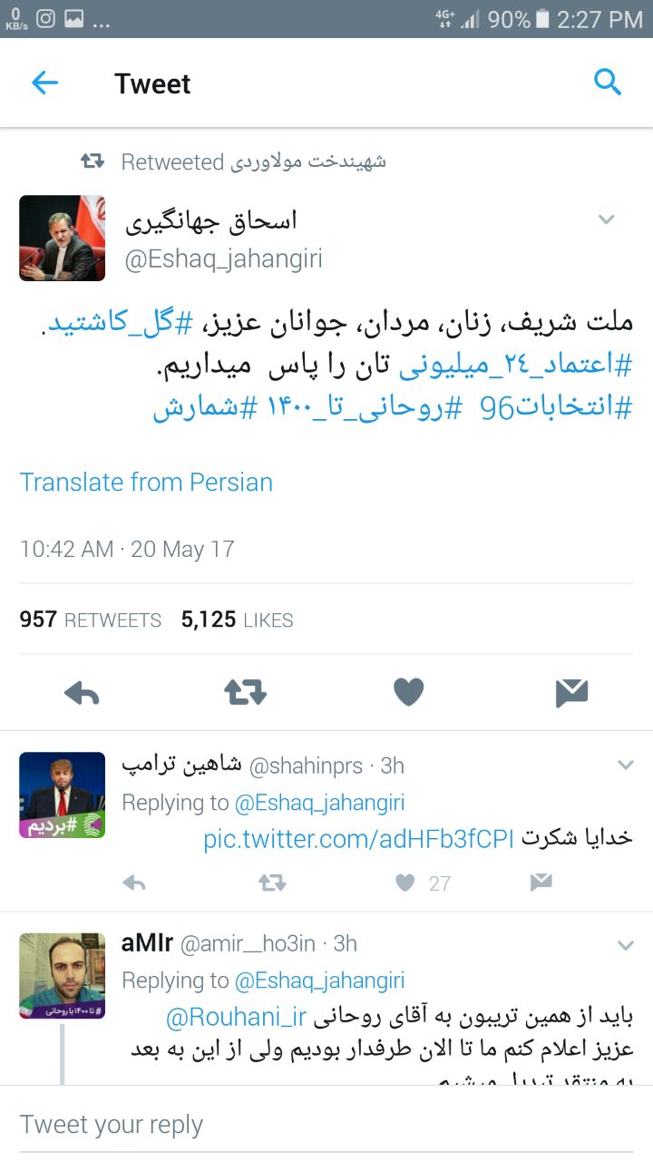 . اسحاق جهانگیری در صفحه توئیترش نوشت: ملت شریف، زنان، مردان، جوانان عزیز گل کاشتید، اعتماد 24 میلیونیتان را پاس می داریم