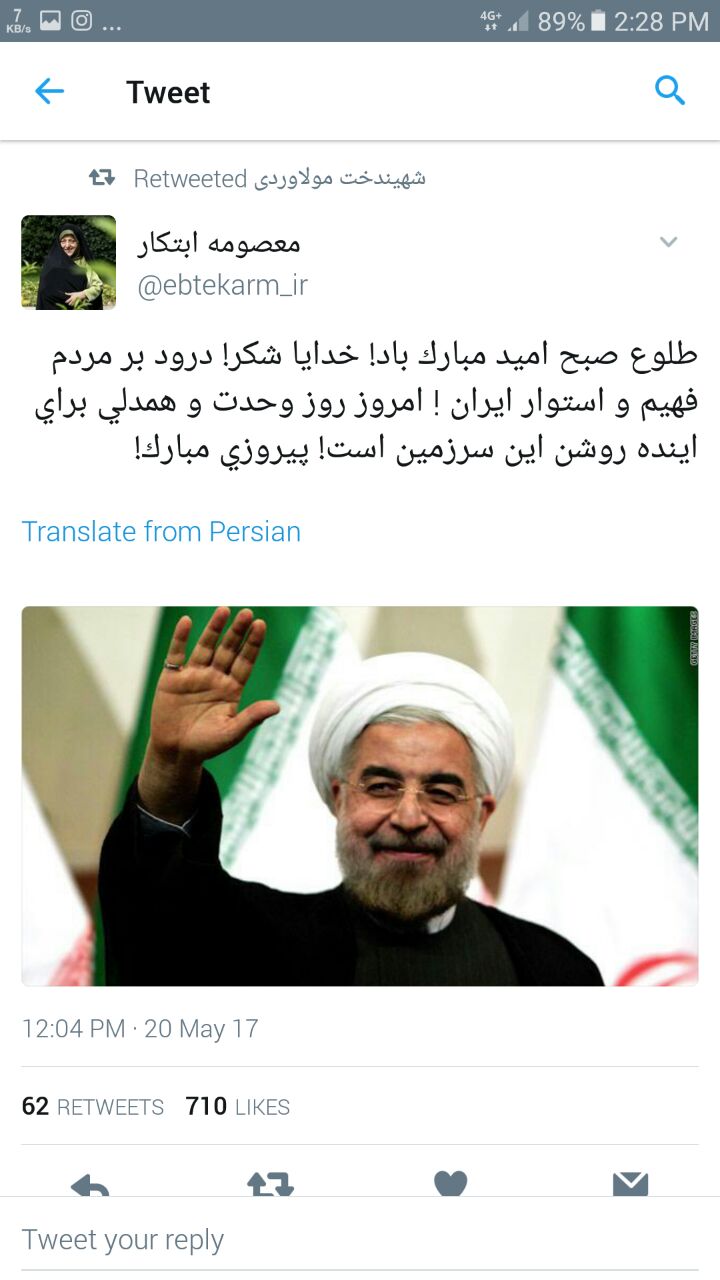 شهیندخت مولاوردی معاون امور زنان رییس جمهوری هم با انتشار شعری از پیروزی حسن روحانی ابراز خرسندی کرد.
